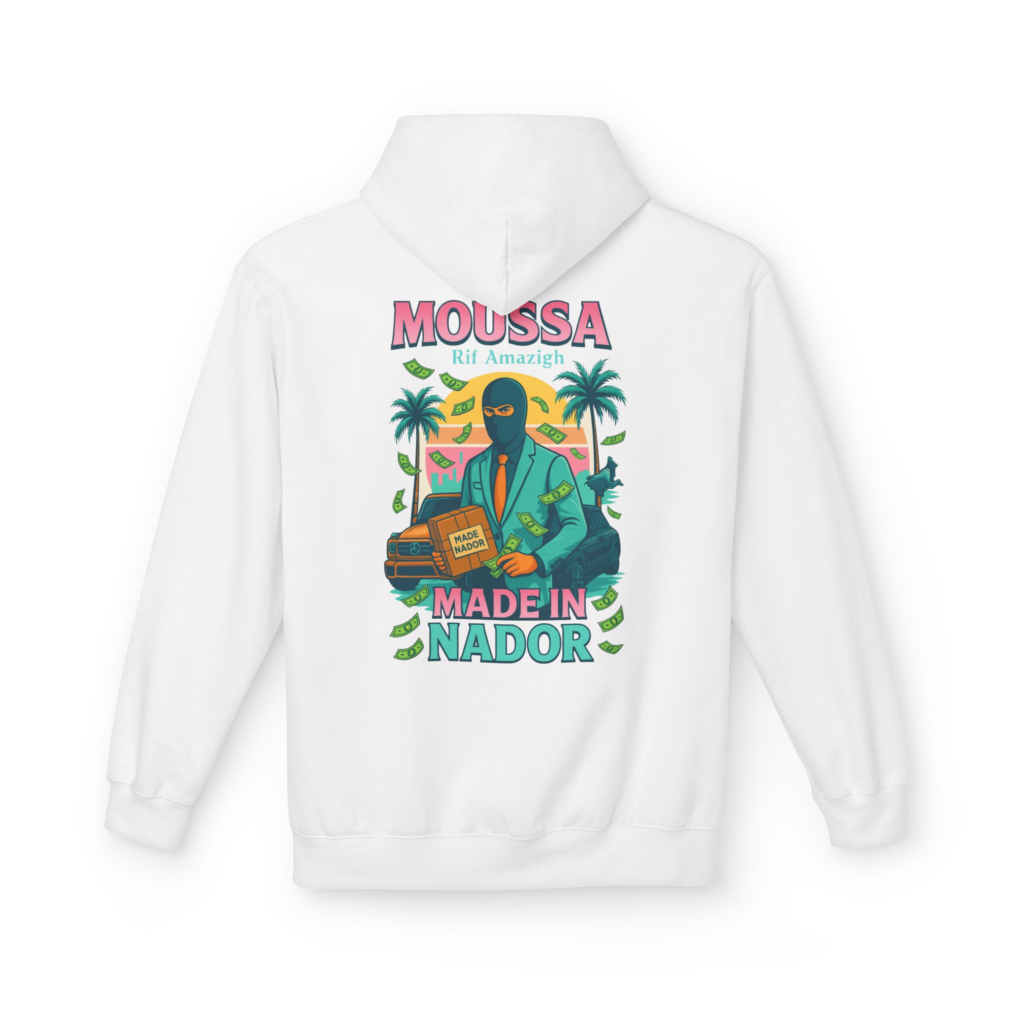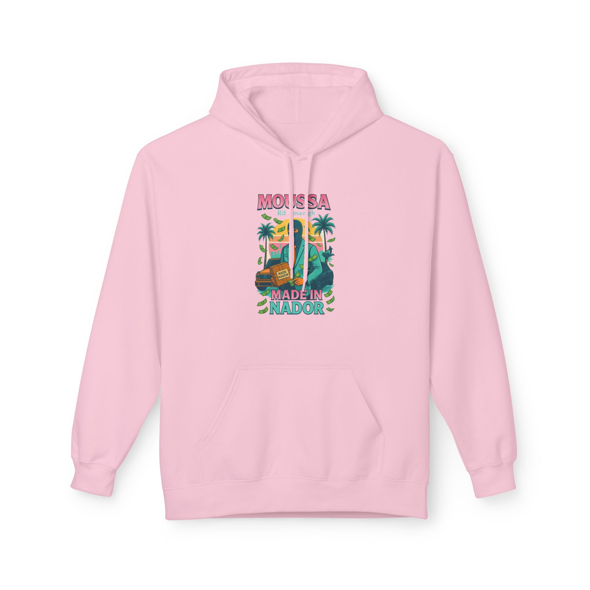 Slip into this midweight fleece hoodie and feel the laid-back confidence of sunlit streets and palm-lined avenues. The vibrant, vintage-inspired artwork—featuring a sharp-suited figure, retro car, and tropical palms—tells a story of hometown pride and easy charm. Soft, substantial fabric drapes in a relaxed, classic fit with dropped shoulders and a roomy pouch pocket that invites lingering hands and warm coffee. Ethically made and OEKO-TEX certified, it’s for people who care about how their clothes are made as much as how they look. Wear it to stroll night markets, meet friends for late brunch, or lean against a warm wall while the city hums—this hoodie holds its own in everyday moments and memories.